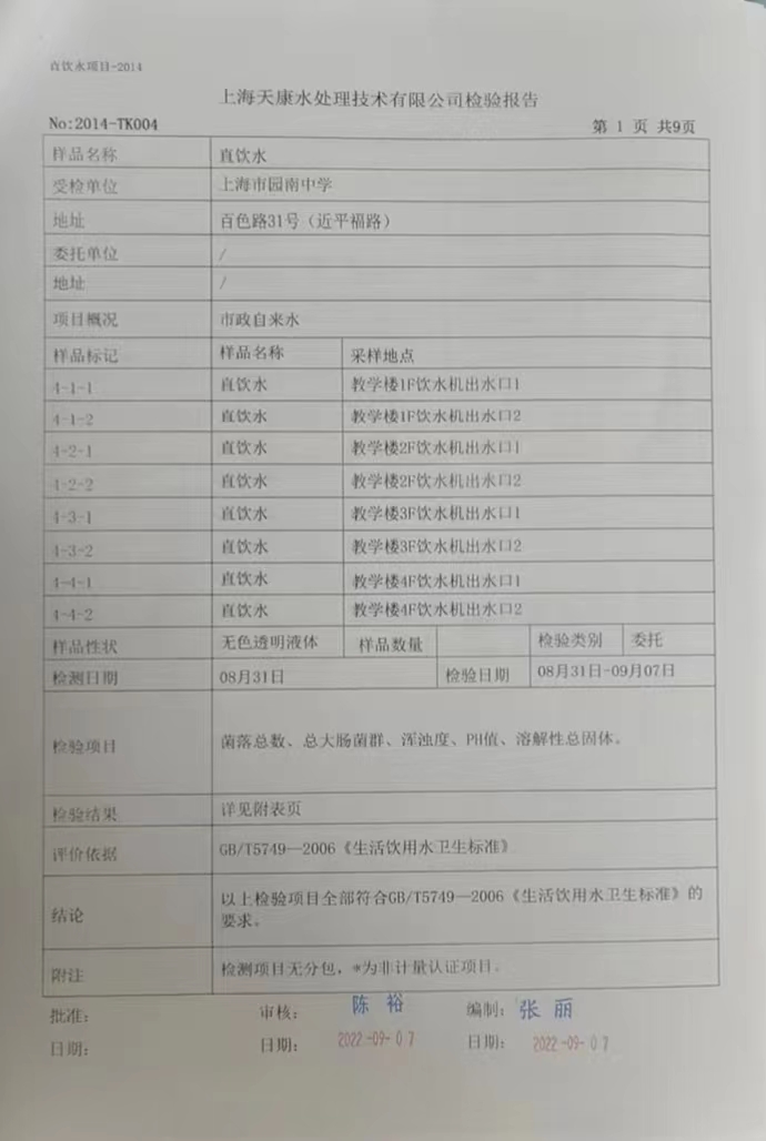 2022年9月第一周直饮水检测报告